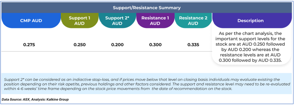 Considering that the company has surpassed its R1 level, current trading levels and risks associated, it is prudent to book profits at the current levels. Hence, a ‘Sell’ recommendation is given on the stock at the current price of AUD 0.31 (as of February 29, 2024, at 10:15 AM AEDT).