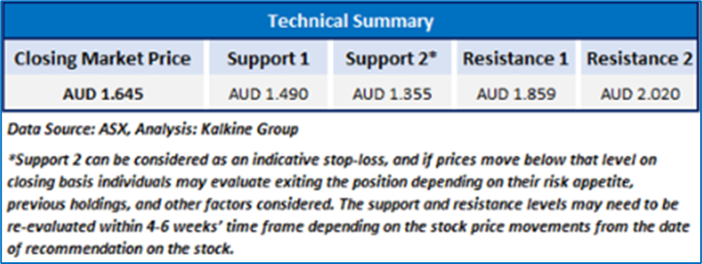 Considering the changes in market sentiments, stock price approached the second resistance, current trading levels and risks associated, it is prudent to book profit at the current levels. Hence, a 'Sell' rating is given on the stock at the current market price of AUD 2.020 as on 15 November 2023 at 10:08 AM AEDT.