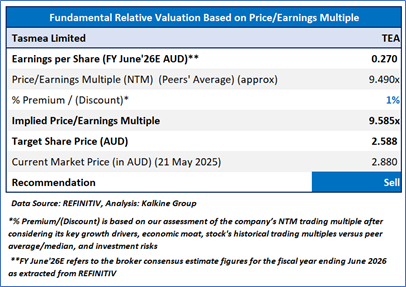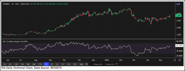 The stock has crossed its first resistance (R1) of AUD 2.772 and is approaching R2 of AUD 3.055. However, its 14-day RSI is showing a reading of ~61.72; hence, the stock may face some consolidation before scaling further upside. Given its current trading levels, recent rally in the share price, and risks associated, it is prudent to sell the stock at the current levels. Hence, a ‘Sell’ recommendation is given on the stock at the closing market price of AUD 2.88, up 5.49%, as of 21 May 2025.