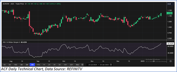 Considering that the stock is approaching its R1 level, share price movement, current trading level, and risks associated, the share price can face consolidation at the current levels. Hence, a ‘Sell’ recommendation is given on the stock at the current price of AUD 1.125 (as of 23 January 2025, at 2:15 PM AEDT).