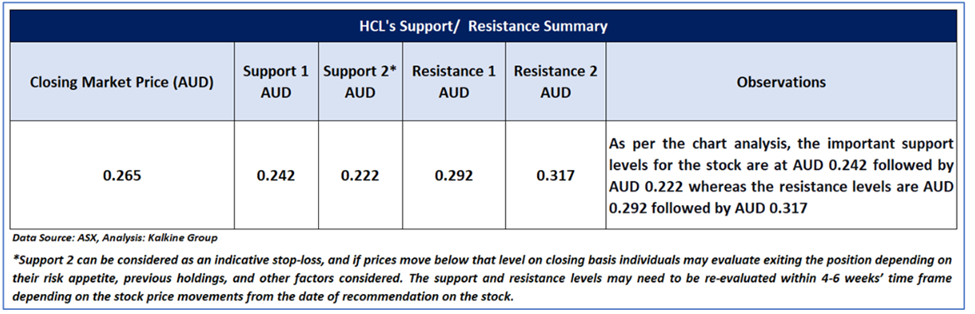 As per the previous recommendation on HCL on 1 Dec 2025, a ‘Speculative Buy’ rating was given on the stock at AUD 0.265, and noted below are the details of support and resistance provided in the previous report: