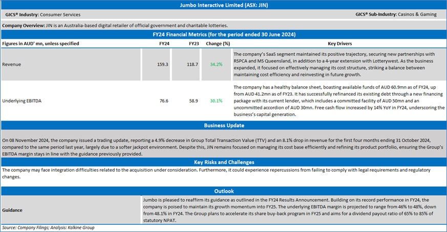 Company Overview: Jumbo Interactive Limited (ASX: JIN) is an Australia-based digital retailer of official government and charitable lotteries. Kalkine’s Daily Report covers the Key Financial Metrics, Risks, Outlook, Technical Analysis along with the Valuation, Target Price, and Recommendation on the stock.