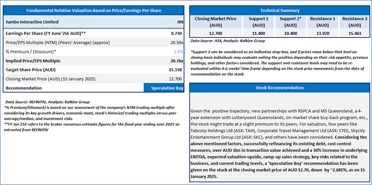 Section 2.0: Jumbo Interactive Limited (‘Speculative Buy’ at AUD 12.700, closing market price per share as on 15 January 2025)