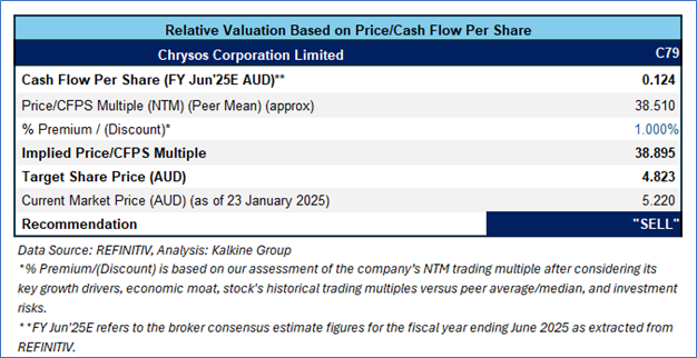 C79 is expected to trade at a premium compared to its peers considering a 69% year-over-year revenue growth in FY24, PhotonAssay™ technology, and strategic partnerships with major players like Barrick Gold and SGS. For conducting the valuation, the following peers have been considered: TechnologyOne Ltd (ASX: TNE), Objective Corporation Ltd (ASX: OCL), and Life360 Inc (ASX: 360).