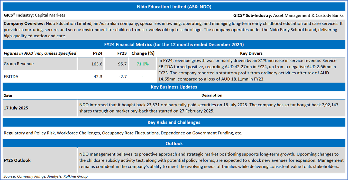 Company Overview: Nido Education Limited (ASX: NDO), an Australian company, specializes in owning, operating, and managing long-term early childhood education and care services. It provides a nurturing, secure, and serene environment for children from six weeks old up to school age. The company operates under the Nido Early School brand, delivering high-quality education and care. Kalkine’s Daily Report covers the Key Financial Metrics, Risks, Outlook, Technical Analysis along with the Valuation, Target Price, and Recommendation on the stock.