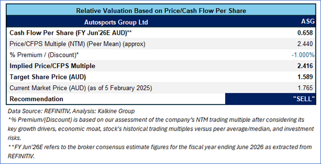 ASG is expected to trade at a slight discount compared to its peers considering the decline in margins, and higher costs and interest expenses in FY24. For conducting valuation, the following peers have been considered: Reject Shop Ltd (ASX: TRS), Michael Hill International Ltd (ASX: MHJ), and Viva Leisure Ltd (ASX: VVA).