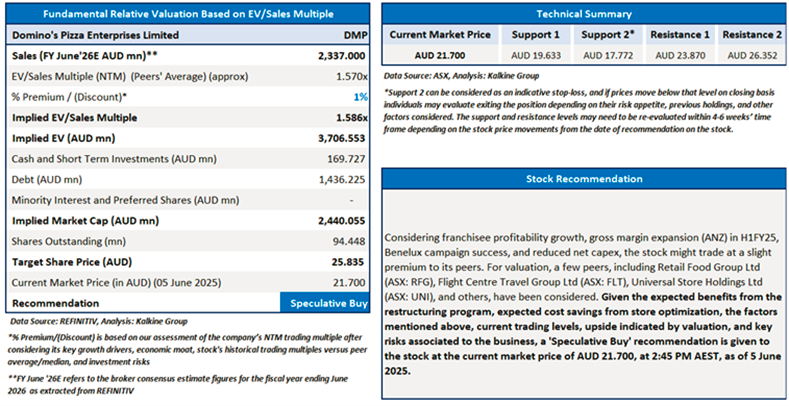 Section 2.0: Domino’s Pizza Enterprises Limited (‘Speculative Buy’ at AUD 21.70, current market price per share as on 5 June 2025)