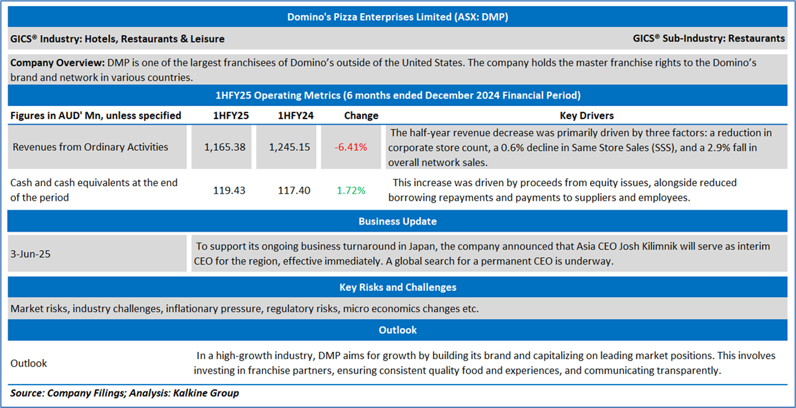 Company Overview: Domino’s Pizza Enterprises Limited (ASX: DMP) is one of the largest franchisees of Domino’s outside of the United States. The company holds the master franchise rights to Domino’s brand and network in various countries. Kalkine’s Daily Report covers the Key Financial Metrics, Risks, Outlook, and Technical Analysis along with the Valuation, Target Price, and Recommendation on the stock.