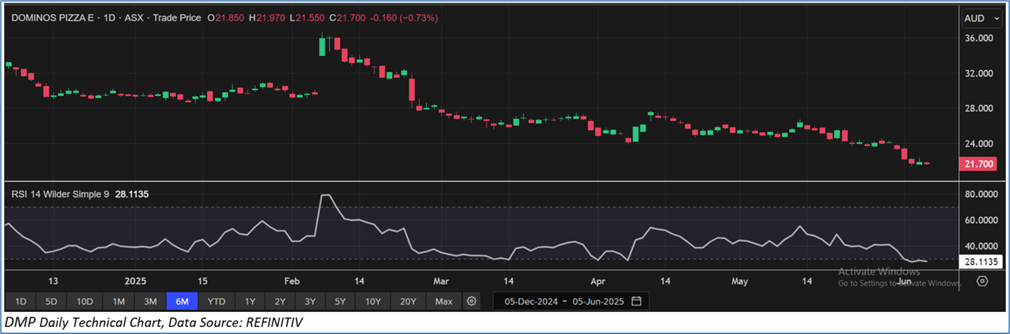 The stock has witnessed a dip of ~18.61% in the last 3 months, and over the past six months, it has decreased by ~33.29%. The stock has a 52-week low and 52-week high of AUD 21.440 and AUD 39.340, respectively, and is currently trading below the 52-week high-low average. DMP was last covered in a report dated ‘15 May 2025’.