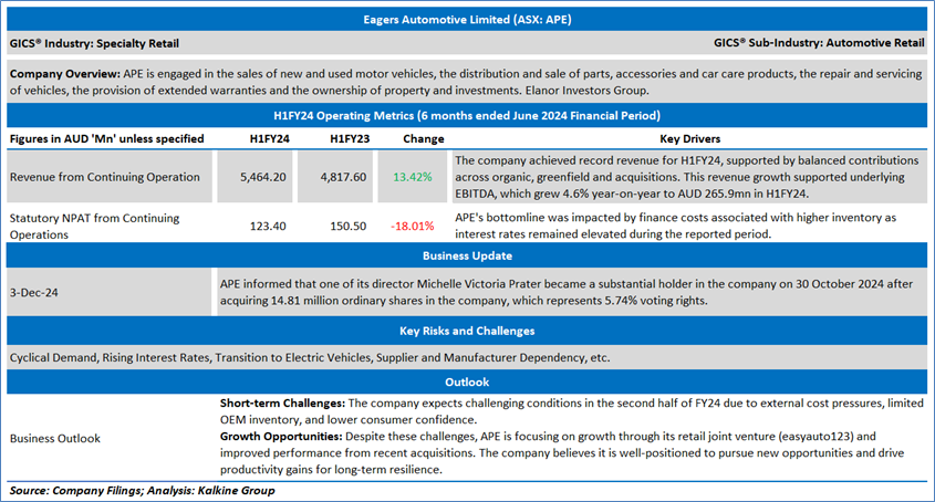 Company Overview: Eagers Automotive Limited (ASX: APE) is engaged in the sales of new and used motor vehicles, the distribution and sale of parts, accessories and car care products, the repair and servicing of vehicles, the provision of extended warranties and the ownership of property and investments. Elanor Investors Group. Kalkine’s Daily Report covers the Key Financial Metrics, Risks, Outlook, and Technical Analysis along with the Valuation, Target Price, and Recommendation on the stock.