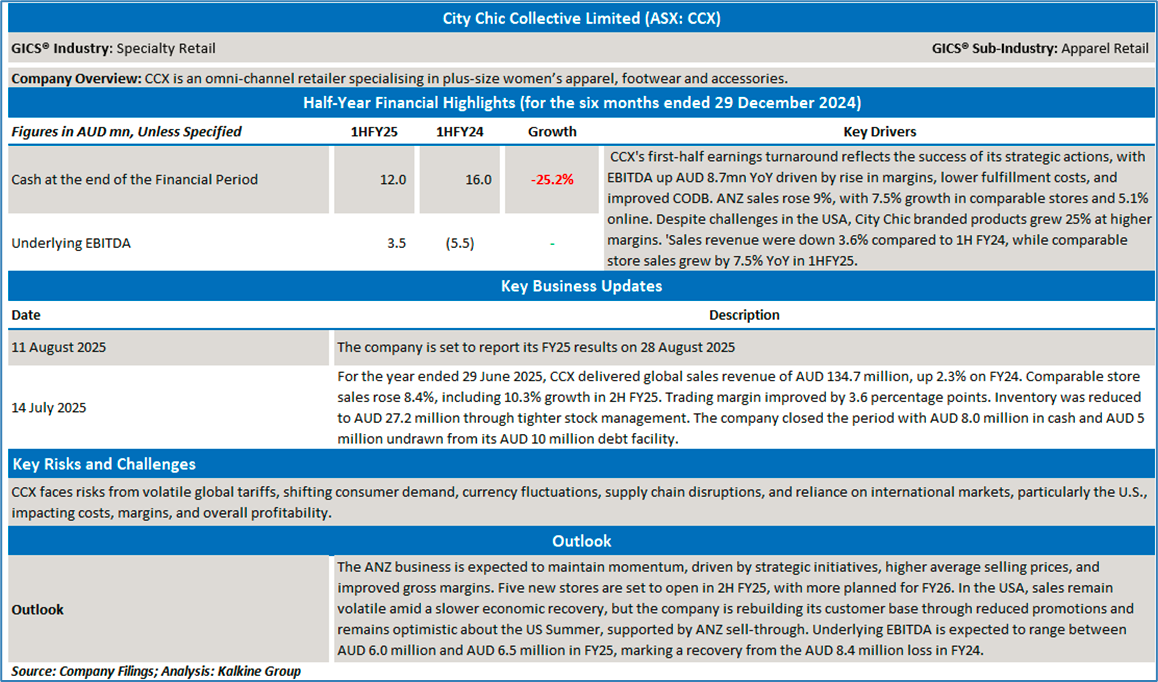 Company Overview: City Chic Collective Limited (ASX: CCX) is a global retailer focused on plus-size women's fashion, including apparel, footwear, and accessories. Its portfolio includes brands like City Chic, Avenue, CCX, Hips & Curves, and Fox & Royal. The company operates through online platforms and retail stores, mainly across Australia and New Zealand. Kalkine’s Daily Report covers the Key Financial Metrics, Risks, Outlook, and Technical Analysis along with the Valuation, Target Price, and Recommendation on the stock.