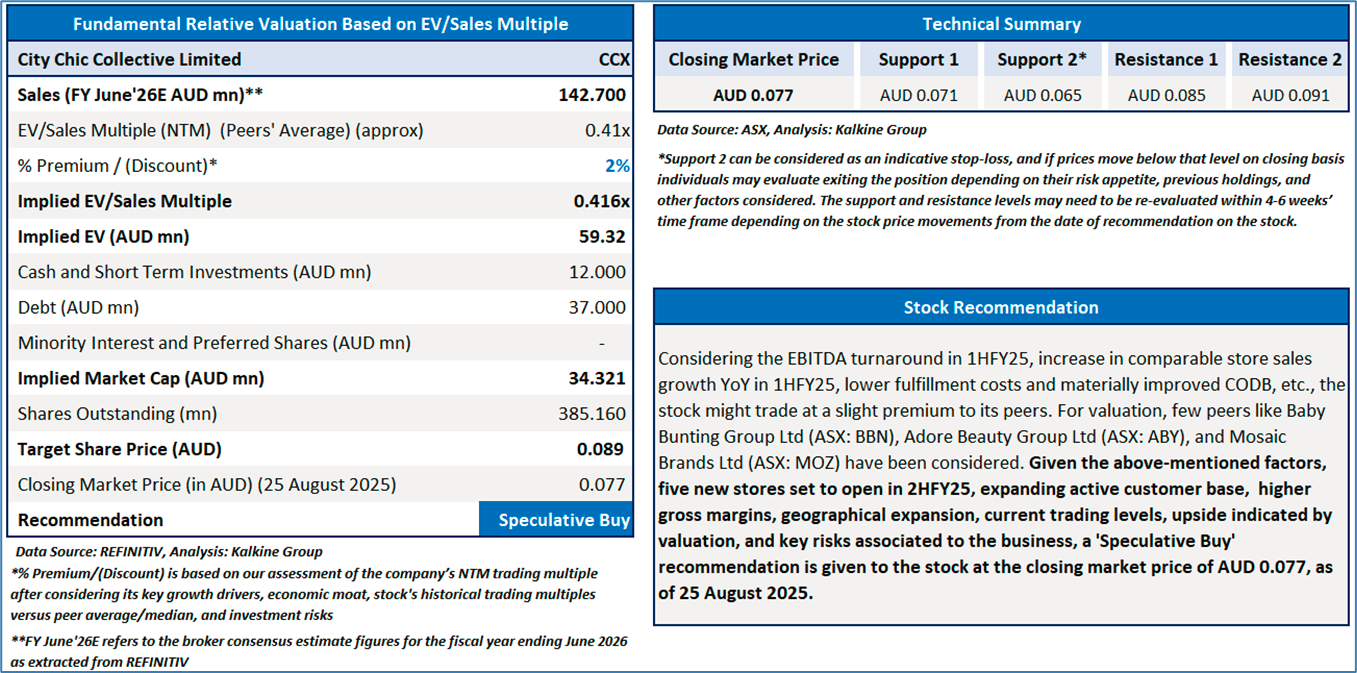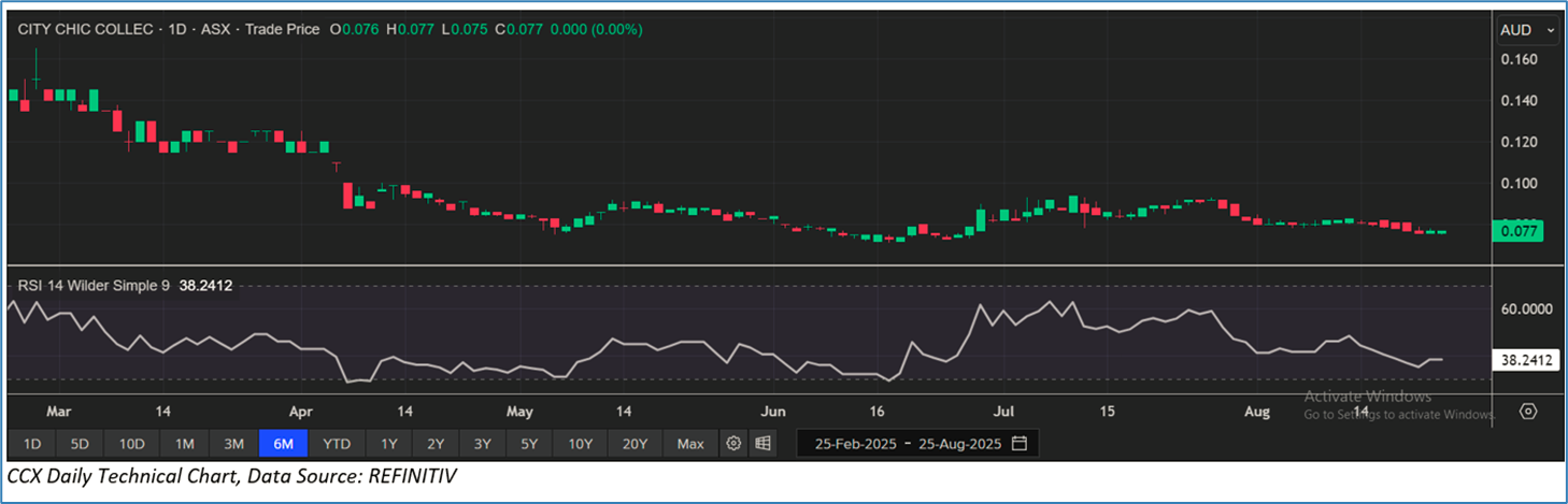 Section 2.0: City Chic Collective Limited (‘Speculative Buy’ at AUD 0.077, closing market price per share as on 25 August 2025)