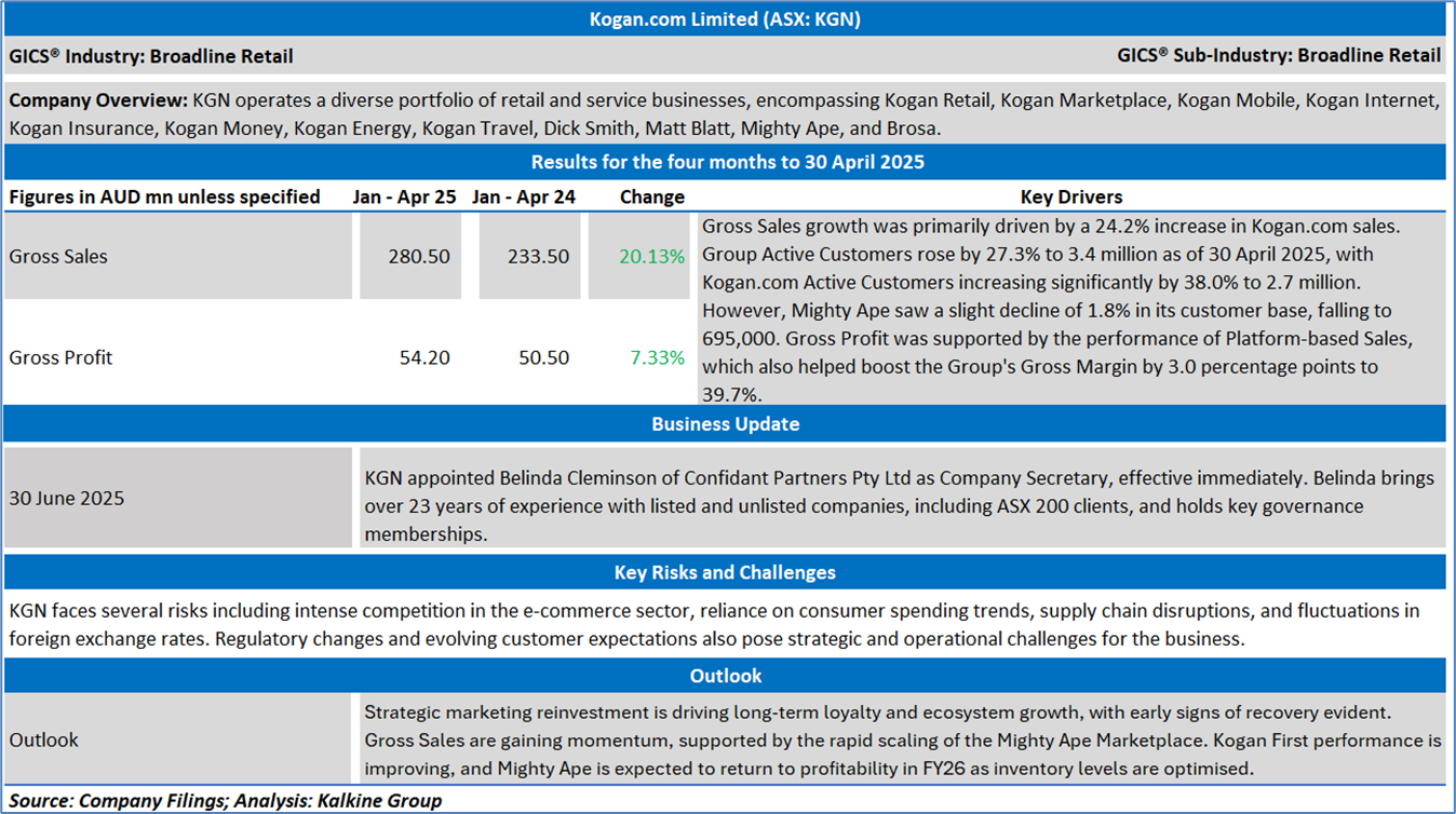 Company Overview: Kogan.com Ltd (ASX: KGN) operates a diverse portfolio of retail and service businesses, encompassing Kogan Retail, Kogan Marketplace, Kogan Mobile, Kogan Internet, Kogan Insurance, Kogan Money, Kogan Energy, Kogan Travel, Dick Smith, Matt Blatt, Mighty Ape, and Brosa. Kalkine’s Daily Report covers the Key Financial Metrics, Risks, Outlook, and Technical Analysis along with the Valuation, Target Price, and Recommendation on the stock.