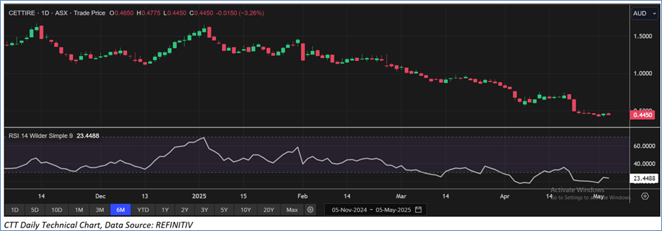 The stock has witnessed a dip of ~61.7% in the last three months, and over the last six months, it has decreased by ~67.6%. The stock has a 52-week low and 52-week high of AUD 0.420 and AUD 3.240, respectively and is currently trading close to the 52-week-low level. CTT was last covered in a report dated ’10 April 2025’.