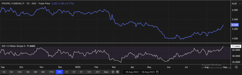 The stock might trade at a premium to peers given its 7.9% revenue growth from FY24 to FY25 to AUD 225.8 million, supported by a 2.3% increase in Average Revenue Per Funeral, a rise in net profit after tax to AUD 20.4 million versus AUD 17.8 million in FY24, and a 4.4% uplift in operating cash flow compared to FY24.