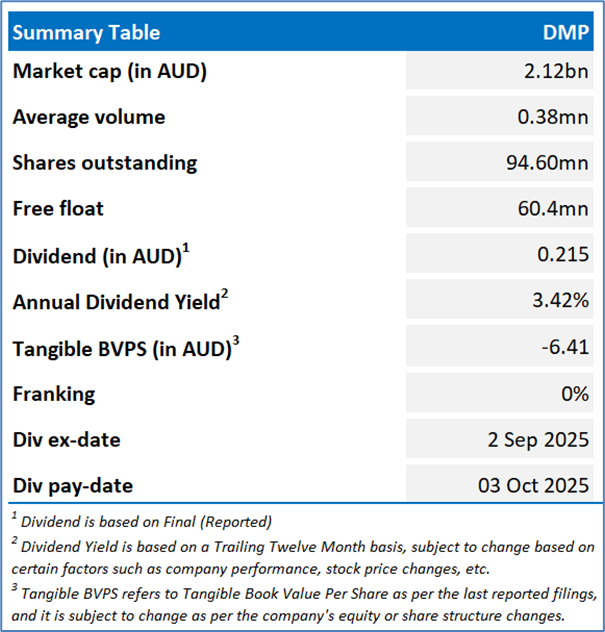 Company Overview: Domino’s Pizza Enterprises Limited (ASX: DMP) is one of the largest franchisees of Domino’s outside of the United States. The company holds the master franchise rights to Domino’s brand and network in various countries. Kalkine’s Daily Report covers the Key Financial Metrics, Risks, Outlook, and Technical Analysis along with the Valuation, Target Price, and Recommendation on the stock.