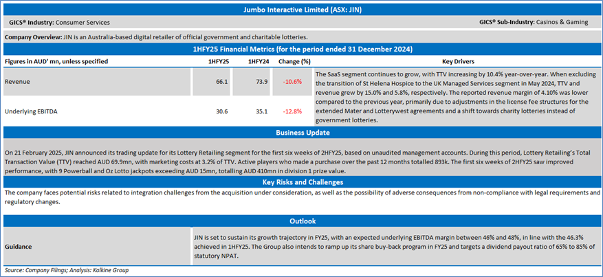 Company Overview: Jumbo Interactive Limited (ASX: JIN) is an Australia-based digital retailer of official government and charitable lotteries. Kalkine’s Daily Report covers the Key Financial Metrics, Risks, Outlook, Technical Analysis along with the Valuation, Target Price, and Recommendation on the stock.