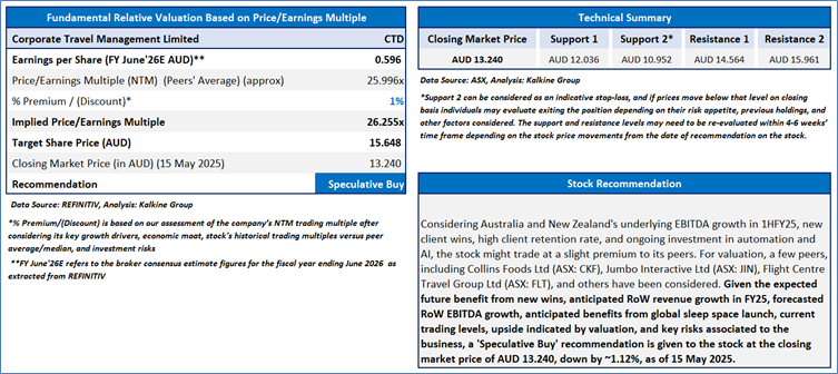 Section 2.0: Corporate Travel Management Limited (‘Speculative Buy’ at AUD 13.240, closing market price per share as on 15 May 2025)