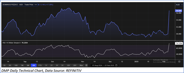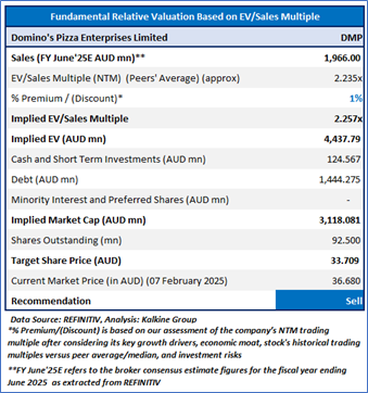 Considering the cost-saving initiatives, restructuring program, revenue growth in FY24, same-store sales (SSS) growth, new product launches, etc., the stock might trade at a slight premium to its peers. For valuation, a few peers like Collins Foods Ltd (ASX: CKF), Flight Centre Travel Group Ltd (ASX: FLT), Corporate Travel Management Ltd (ASX: CTD), and others have been considered. Given. Considering that the stock is approaching its R2 level, sharp rally in share price, current trading level, and risks associated, the share price can face consolidation at the current levels. Hence, a ‘Sell’ recommendation is given on the stock at the current price of AUD 36.68 (as of 7 Februrauy 2025, at 11:00 AEDT).