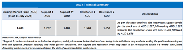 As per the previous ‘Earnings Hunter’ Report published on AAC on 11 July 2024, Kalkine provided an ‘Attractive’ stance on the stock at AUD 1.400 based on ‘Earnings Hunter Score’, and noted below are the details of support and resistance provided in the previous report.