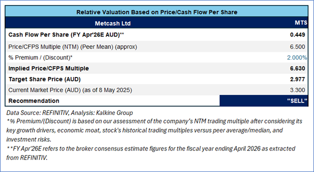 MTS is expected to trade at a slight premium to its peers considering the recent acquisitions, like Superior Food, which diversify and strengthen Metcash’s food business, add immediate scale in the attractive foodservice market. For conducting valuation, the following peers have been considered: Elders Ltd (ASX: ELD), Synlait Milk Ltd (ASX: SM1), and Endeavour Group Ltd (ASX: EDV).