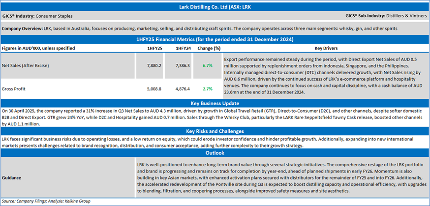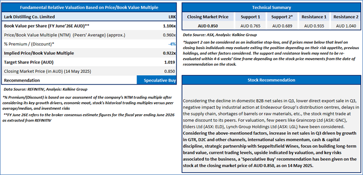 Section 2.0: Lark Distilling Co. Limited (‘Speculative Buy’ at AUD 0.850, closing market price per share as on 14 May 2025)
