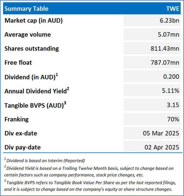 The stock has witnessed a dip of ~29.22% in the last 6 months, and over the past 1 year, it has decreased by ~35.12%. The stock has a 52-week low and 52-week high of AUD 7.380 and AUD 12.490, respectively, and is currently trading near to the 52-week low. TWE was last covered in a report dated ‘08 July 2025’.