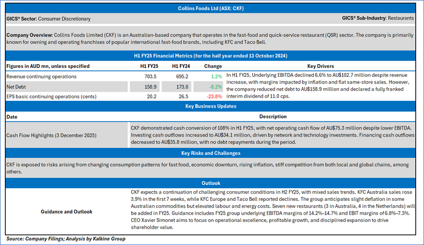 Company Overview: Collins Foods Limited (CKF) is an Australian-based company that operates in the fast-food and quick-service restaurant (QSR) sector. The company is primarily known for owning and operating franchises of popular international fast-food brands, including KFC and Taco Bell. Kalkine’s Daily Report covers the Key Financial Metrics, Risks, Outlook, Technical Analysis along with the Valuation, Target Price, and Recommendation on the stock.
