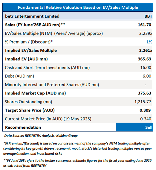Given the revenue growth and positive EBITDA in 1HFY24, expected benefits from TopSport acquisition as it increases the scale of the business, the stock might trade at a slight premium to its peers. For valuation, a few peers like, Jumbo Interactive Ltd (ASX: JIN), Lottery Corporation Ltd (ASX: TLC), Betmakers Technology Group Ltd (ASX: BET), and others have been considered.