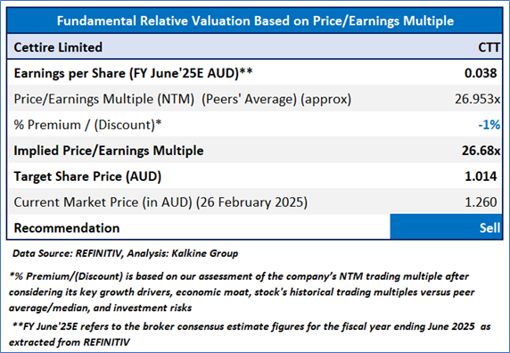 CTT is expected to trade at a slight discount to its peers considering the cautious outlook shared by management, decline in H1FY25 EBITDA and NPAT, impact of US tariff changes on CTT's future earnings. For conducting valuation, the following peers have been considered: Temple & Webster Group Ltd (ASX: TPW), Lovisa Holdings Ltd (ASX: LOV), Universal Store Holdings Ltd (ASX: UNI), and others.