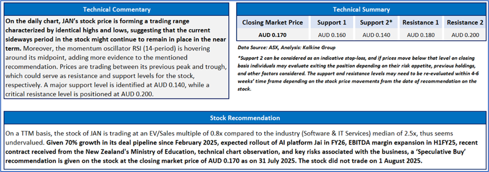 As per the previous recommendation on JAN on August 01st,2025, a ‘Speculative Buy’ rating was given on the stock at AUD 0.170, and noted below are the details of support and resistance provided in the previous report: