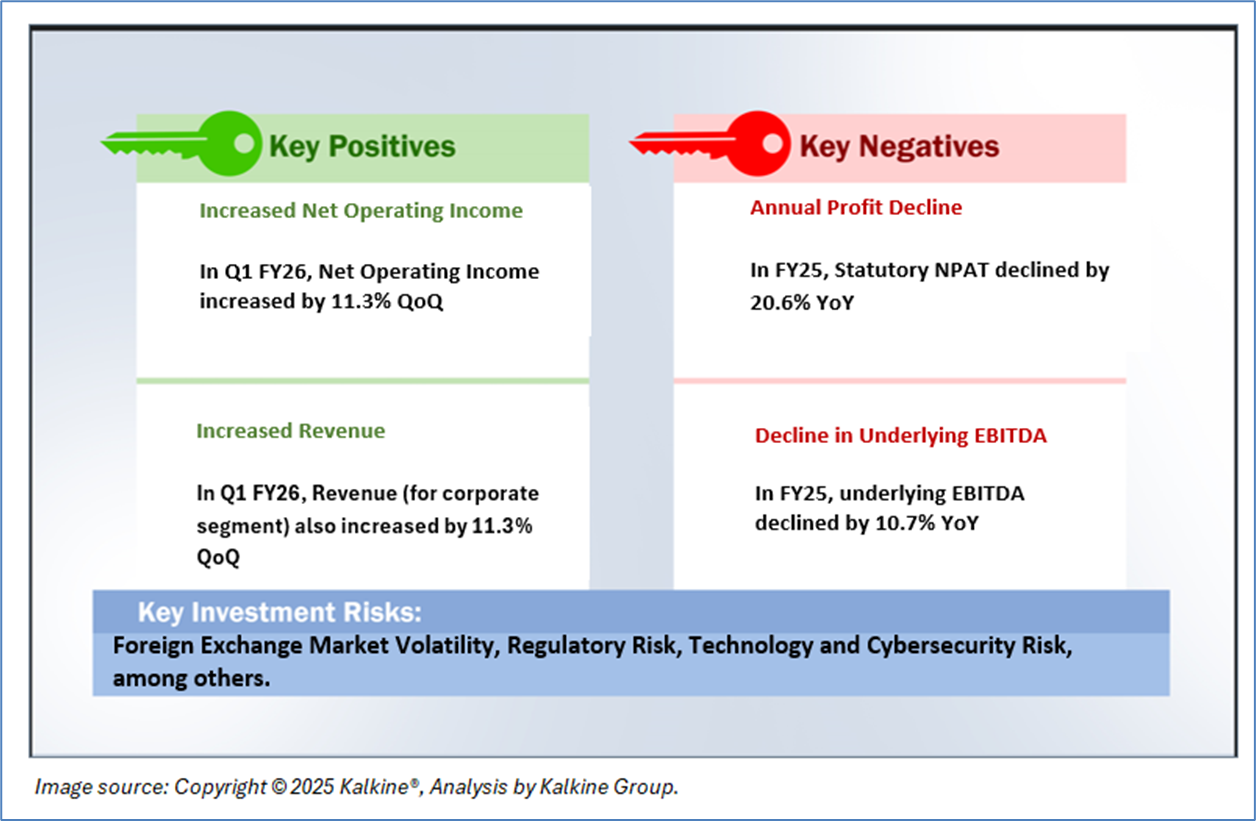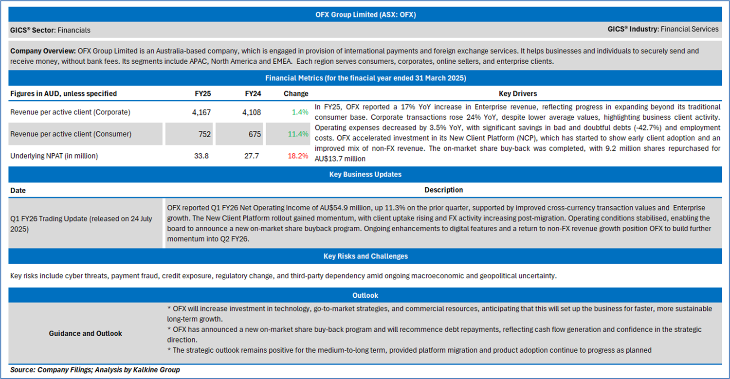Company Overview: OFX Group Limited (ASX: OFX) is a global provider of international payment and foreign exchange services. The company operates a digital platform that enables individuals, small-to-medium enterprises (SMEs), and online sellers to make and receive cross-border payments efficiently and securely. Kalkine’s Daily Report covers the Key Financial Metrics, Risks, Outlook, Technical Analysis along with the Valuation, Target Price, and Recommendation on the stock.