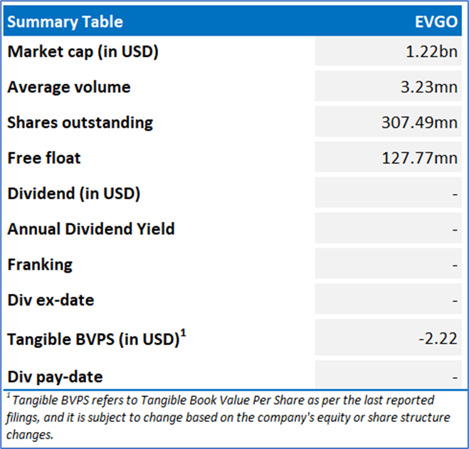 Company Overview: EVgo Inc. (NASDAQ: EVGO) is a public fast charging provider, operating more than 1,100 fast charging stations in over 40 U.S. states. The company uses a strategic approach, partnering with top businesses nationwide to deploy charging infrastructure in easily accessible, localized areas. Kalkine’s Daily Report covers the Key Financial Metrics, Risks, Outlook, Technical Analysis along with the Valuation, Target Price, and Recommendation on the stock.