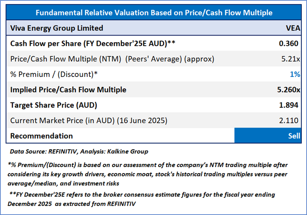 VEA is expected to trade at a slight premium to its peers, on the back of expansion of OTR network, expected EBITDA (RC) in FY25, and acquisition of Liberty Convenience. For conducting valuation, the following peers have been considered: New Hope Corporation Ltd (ASX: NHC), Santos Ltd (ASX: STO), and Whitehaven Coal Ltd (ASX: WHC) have been considered.