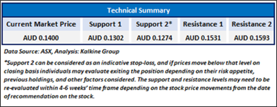 As per the previous recommendation on COE on 3 January 2024, a ‘Hold’ rating was given on the stock at AUD 0.1400, and noted below are the details of support and resistance provided in the previous report: