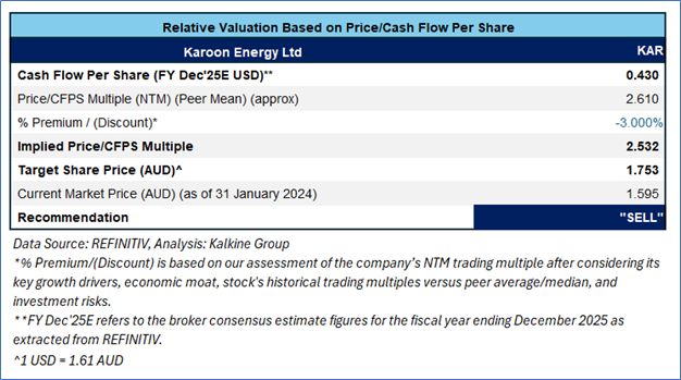 KAR is expected to trade at a slight discount compared to its peers considering the decline in production, operational issues, and higher expected production costs. For conducting valuation, the following peers have been considered: Amplitude Energy Ltd (ASX: AEL), Strike Energy Ltd (ASX: STX), and Alligator Energy Ltd (ASX: AGE).