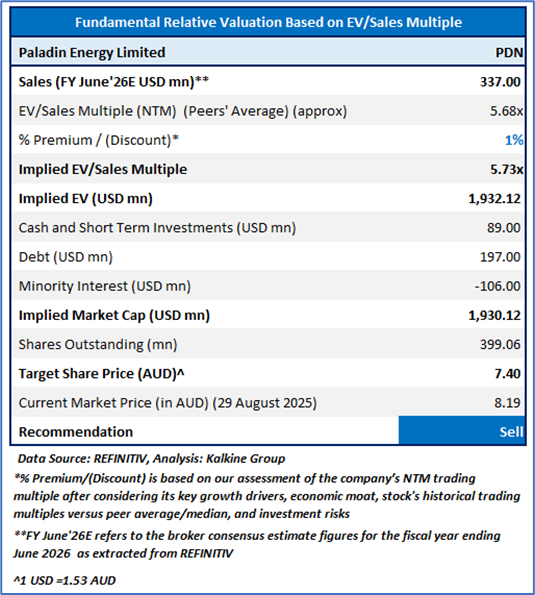 Considering the completion of Fission Uranium Corp. acquisition, successful PLS winter drilling program, 13 sales agreements with tier-one global customers, etc., the stock might trade at a slight premium to its peers. For valuation, a few peers Lotus Resources Ltd (ASX: LOT), Boss Energy Ltd (ASX: BOE), Amplitude Energy Ltd (ASX: AEL), and others have been considered.