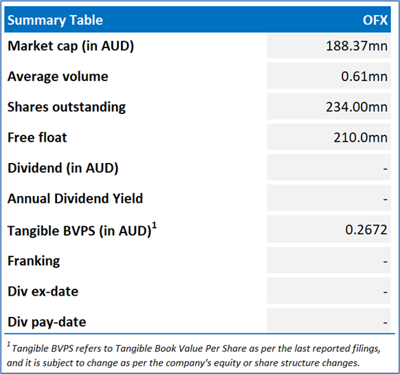Company Overview: OFX Group Limited (ASX: OFX) is a cross-border payments specialist with a presence in nine countries. The Sydney-based company provides money transfers and foreign exchange services across more than 50 currencies to corporate, consumer and enterprise clients. Kalkine’s Daily Report covers the Key Financial Metrics, Risks, Outlook, and Technical Analysis along with the Valuation, Target Price, and Recommendation on the stock.
