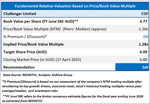 Considering the NPAT guidance for FY25, increase in normalised and statutory NPAT and ROE in H1FY25, the stock might trade at a slight premium to its peers. For valuation, few peers like QBE Insurance Group Ltd (ASX: QBE), AMP Ltd (ASX: AMP), Perpetual Ltd (ASX: PPT), and others have been considered. The stock has crossed its first resistance and has entered overbought zone as represented by 14-day RSI reading of ~71.50. Hence, the stock may face some resistance before scaling further upside. Given its current trading levels, recent rally in the share price, and risks associated, it is prudent to book profit at the current levels. Hence, a ‘Sell’ recommendation is given on the stock at the closing market price of AUD 6.80, as of 17 April 2025.