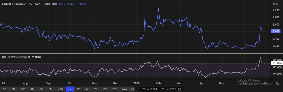 The stock has crossed its first resistance (R1) of AUD 3.338. However, its 14-day RSI is showing a reading of ~71.07; hence, the stock may face some consolidation before scaling further upside. Given its current trading levels, recent rally in the share price, and risks associated, it is prudent to sell the stock at the current levels. Hence, a ‘Sell’ recommendation is given on the stock at the current market price of AUD 3.610, as of 26 June 2025 at 10:00 AM AEST.