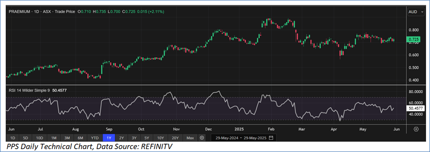 The stock has witnessed a dip of ~2.68% in the last 1 month, and over the past six months, it has increased by ~5.84%. The stock has a 52-week low and 52-week high of AUD 0.415 and AUD 0.893, respectively, and is currently trading above the 52-week high-low average. PPS was last covered in a report dated ‘24 April 2025’.
