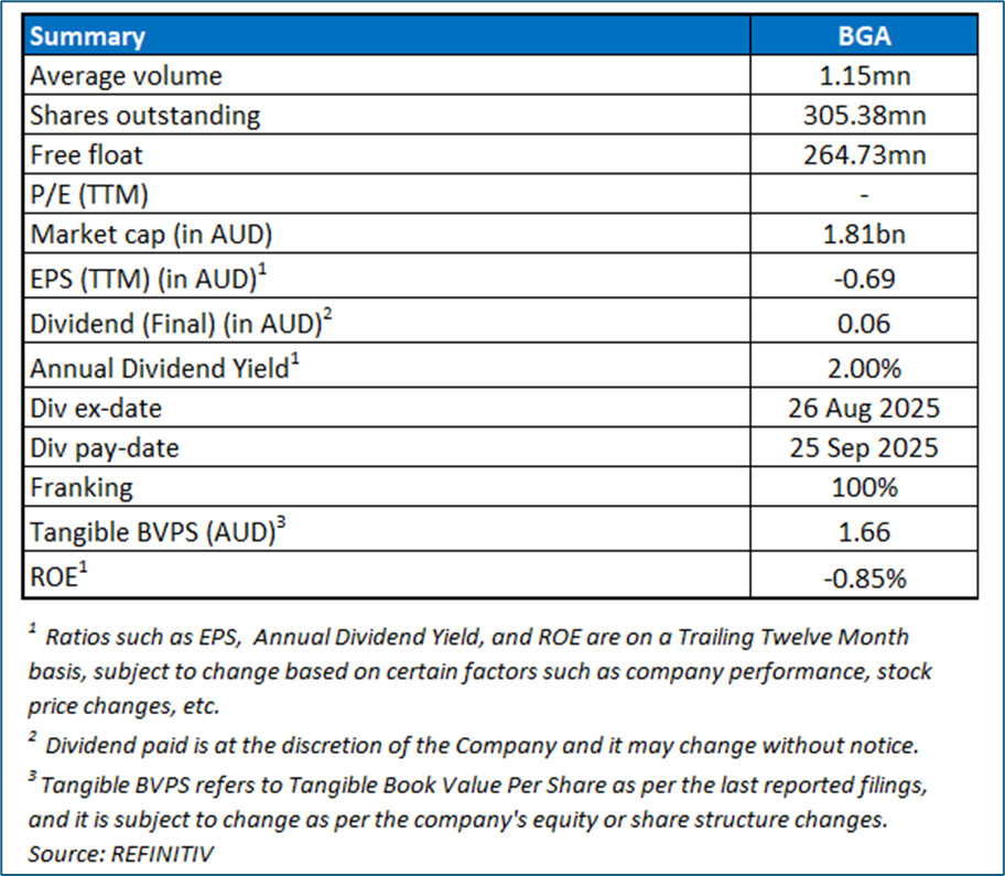 Bega Cheese Limited is an Australia-based company engaged in receiving, processing, manufacturing, and distributing dairy and other food-related products. It operates in two segments: Branded, and Bulk.