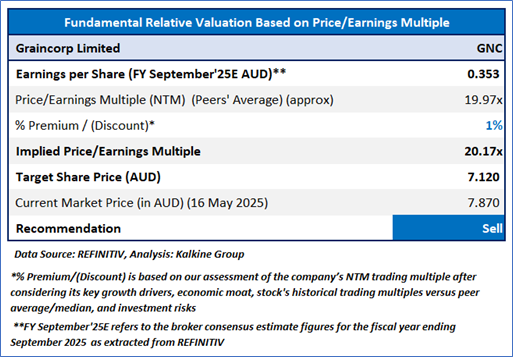 Given the H1F25 revenue and NPAT growth, increase in FY25 EBITDA and NPAT guidance, higher production in East Coast Australia (ECA), early start of winter crop harvest in Queensland and Northern NSW, the stock might trade at a slight premium to its peers. For valuation, a few peers like, A2 Milk Company Ltd (ASX: A2M), Bega Cheese Ltd (ASX: BGA), Select Harvests Ltd (ASX: SHV), and others have been considered.