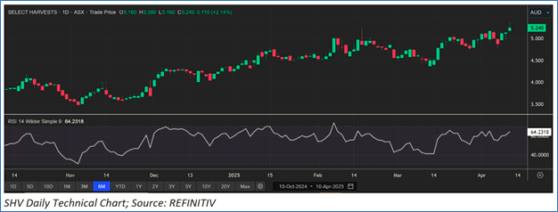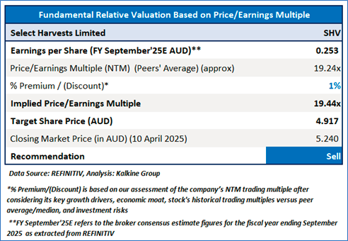 SHV is expected to trade at a slight premium to its peers considering the turnaround in SHV's bottom-line in FY24, FY25 outlook for pricing, crop production and exports. For conducting valuation, the following peers have been considered: Cobram Estate Olives Ltd (ASX: CBO), Ridley Corporation Ltd (ASX: RIC), Bega Cheese Ltd (ASX: BGA), and others were considered.
