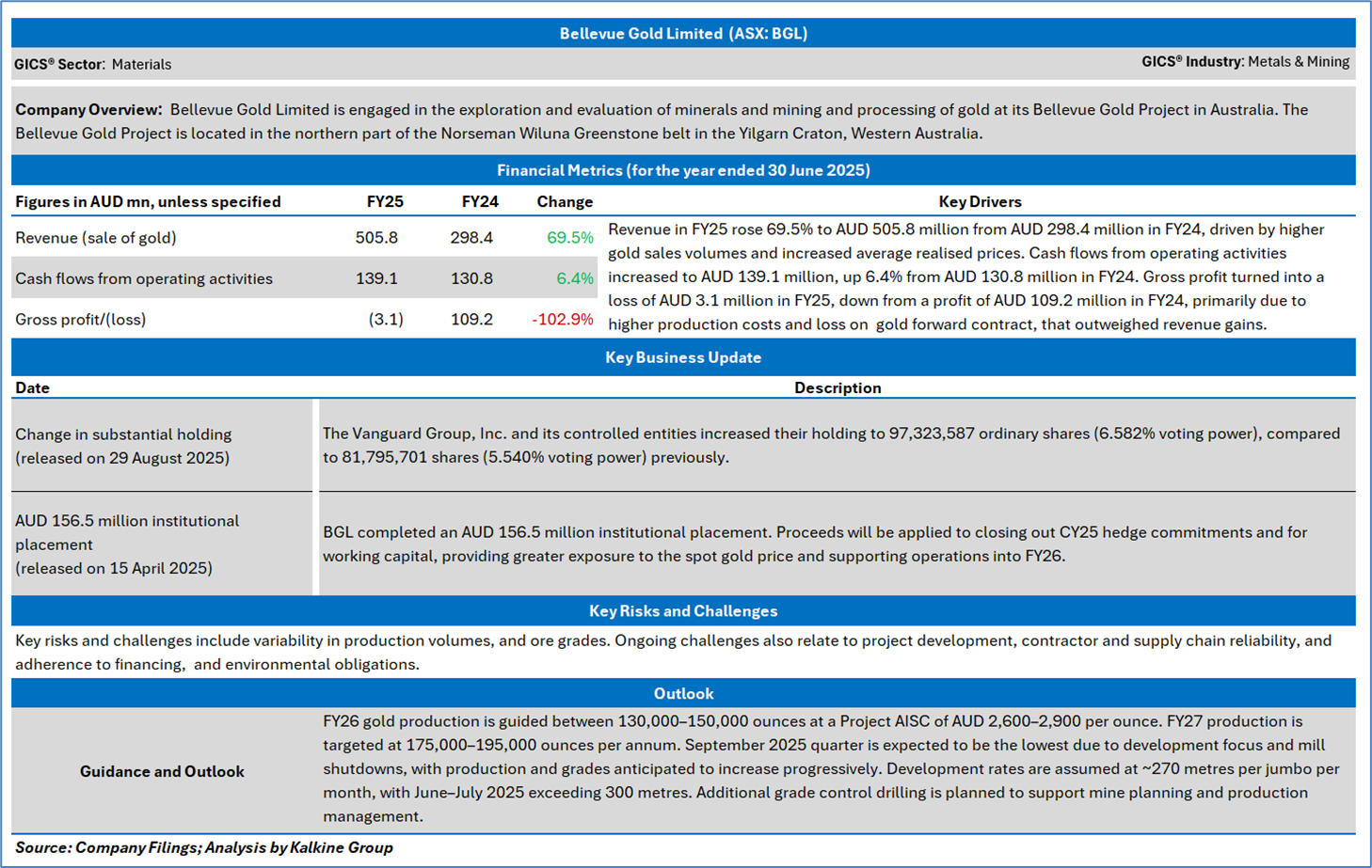 Company Overview: Bellevue Gold Limited (ASX: BGL) is an Australian gold mining company focused on the exploration, development, mining, and processing of high-grade gold deposits. Its flagship asset is the Bellevue Gold Project located in the prolific Goldfields region of Western Australia. Kalkine’s Daily Report covers the Key Financial Metrics, Risks, Outlook, Technical Analysis along with the Valuation, Target Price, and Recommendation on the stock.