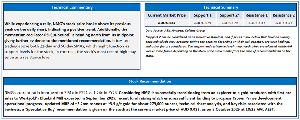 As per the previous recommendation on NMG on 03 October 2025, a ‘Speculative Buy’ rating was given on the stock at AUD 0.330, and noted below are the details of support and resistance provided in the previous report: