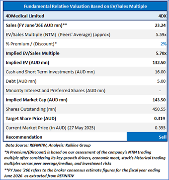 Stock might trade at a slight premium to its peers, considering contract win with Intermountain Health, deployment of 4DX’s recently FDA-cleared Pulmonary Hypertension Analysis (PHA™) product, etc. For valuation, a few peers like Oneview Healthcare PLC (ASX: ONE), Alcidion Group Ltd (ASX: ALC), Nanosonics Ltd (ASX: NAN), and others have been considered.