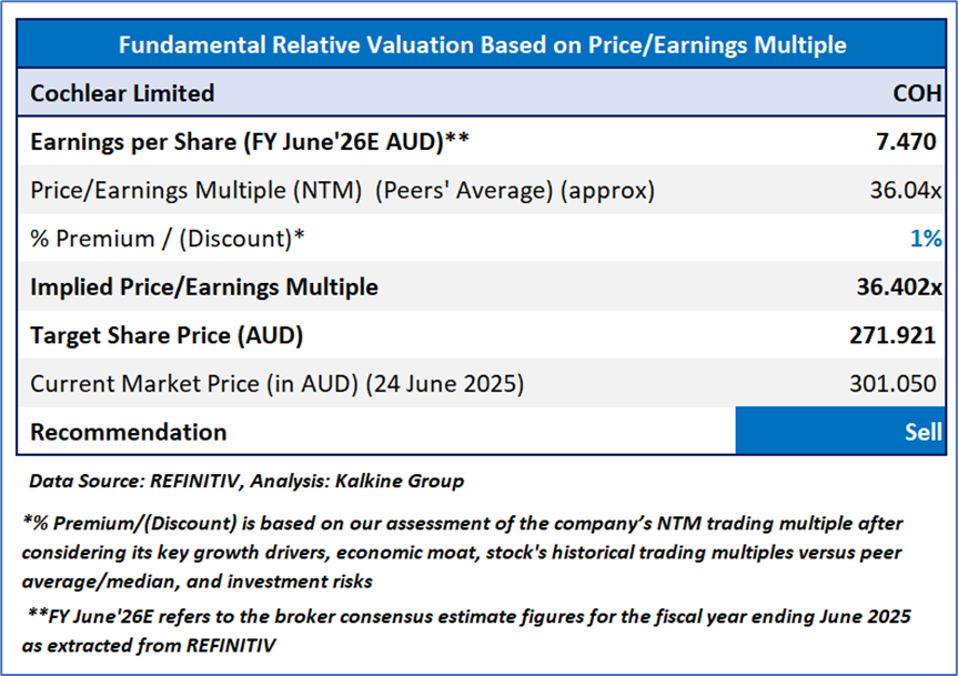 Stock might trade at a slight premium to its peers considering the increased COH implant unit sales in 1HFY25, higher-priced product mix, US and Asia pacific growth, YoY increased underlying net profit in 1HFY25, and expected NPAT for FY25. For conducting the valuation, the following peers have been considered: Regis Healthcare Ltd (ASX: REG), Healius Ltd (ASX: HLS), Resmed Inc (ASX: RMD) and others have been considered.