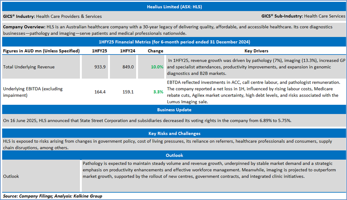 Company Overview: Healius Limited (ASX: HLS) is an Australian healthcare company with a 30-year legacy of delivering quality, affordable, and accessible healthcare. Its core diagnostics businesses—pathology and imaging—serve patients and medical professionals nationwide. Kalkine’s Daily Report covers the Key Financial Metrics, Risks, Outlook, Technical Analysis along with the Valuation, Target Price, and Recommendation on the stock.