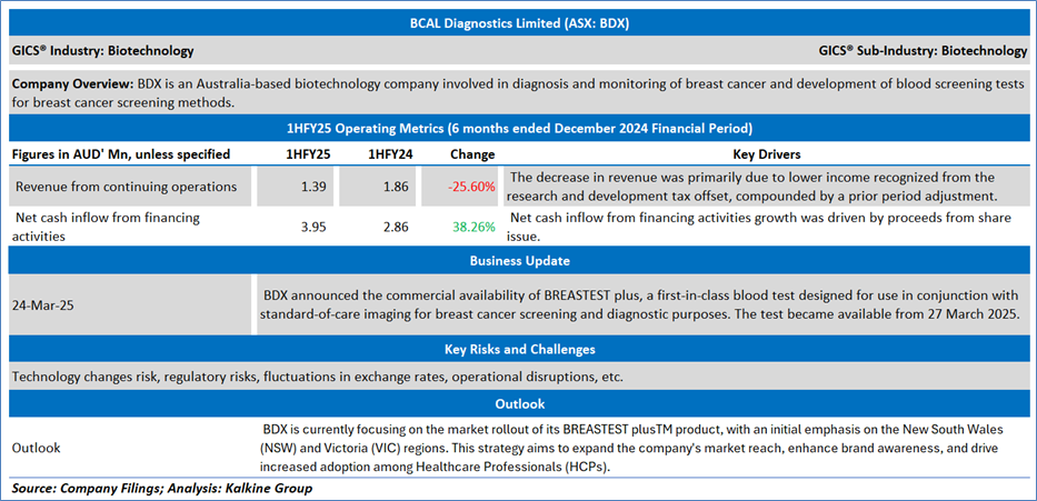 Section 2.0: BCAL Diagnostics Limited (‘Speculative Buy’ at AUD 0.085, closing market price per share as on 23 April 2025)